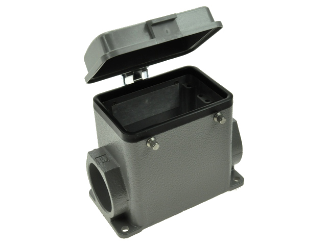 Connector housing; Han A; 09200320221; 32A = 2x16A; metal; straight; for panel; one side cable entry; with cover; for double locking levers; entry for PG29 cable gland; grey; IP65; Harting; RoHS Item ID: 21716 Item ID: 21716 MOQ: 1 Multiple: 1