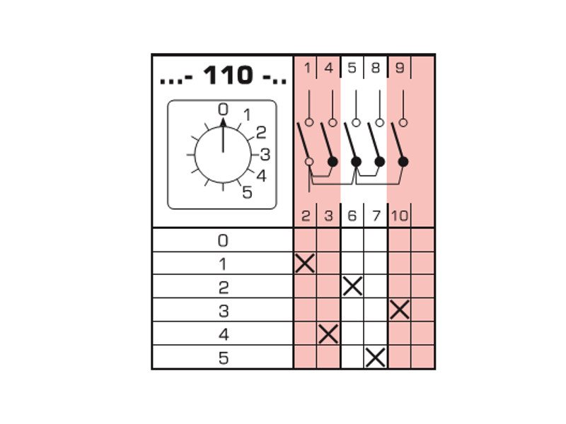| Switch; cam; rotary; LW26-10-M0-F/1P 0-5; 6 positions; OFF-5xON; 45°; bistable; panel mounting; 1 way; 3 layers; screw; 10A; 440V AC; black; 8mm; 30x30mm; 46mm; Howo | |||||||||||||