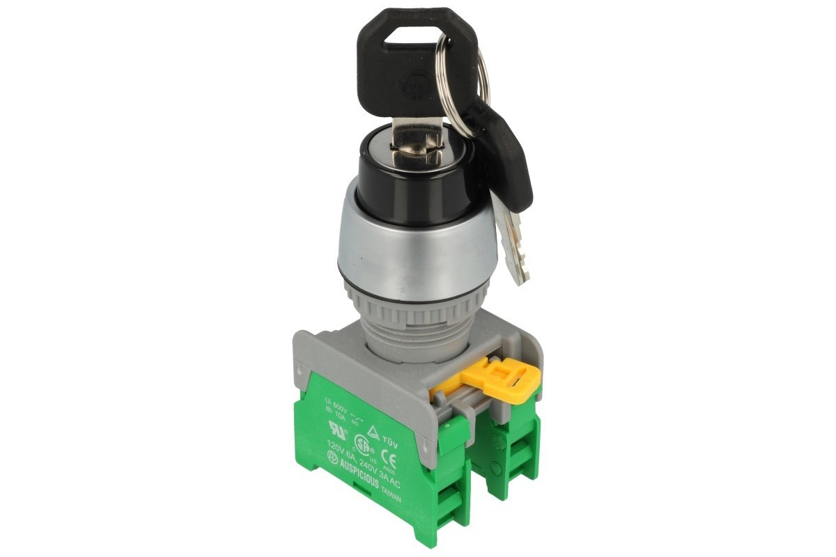 | Switch; key switch; KS22-1-O/C; ON-OFF+OFF-ON; 2 ways; 90°; 2 positions; bistable; panel mounting; screw; 3A; 230V AC; 22mm; 50mm; plastic; IP65; Auspicious | |||||||||||