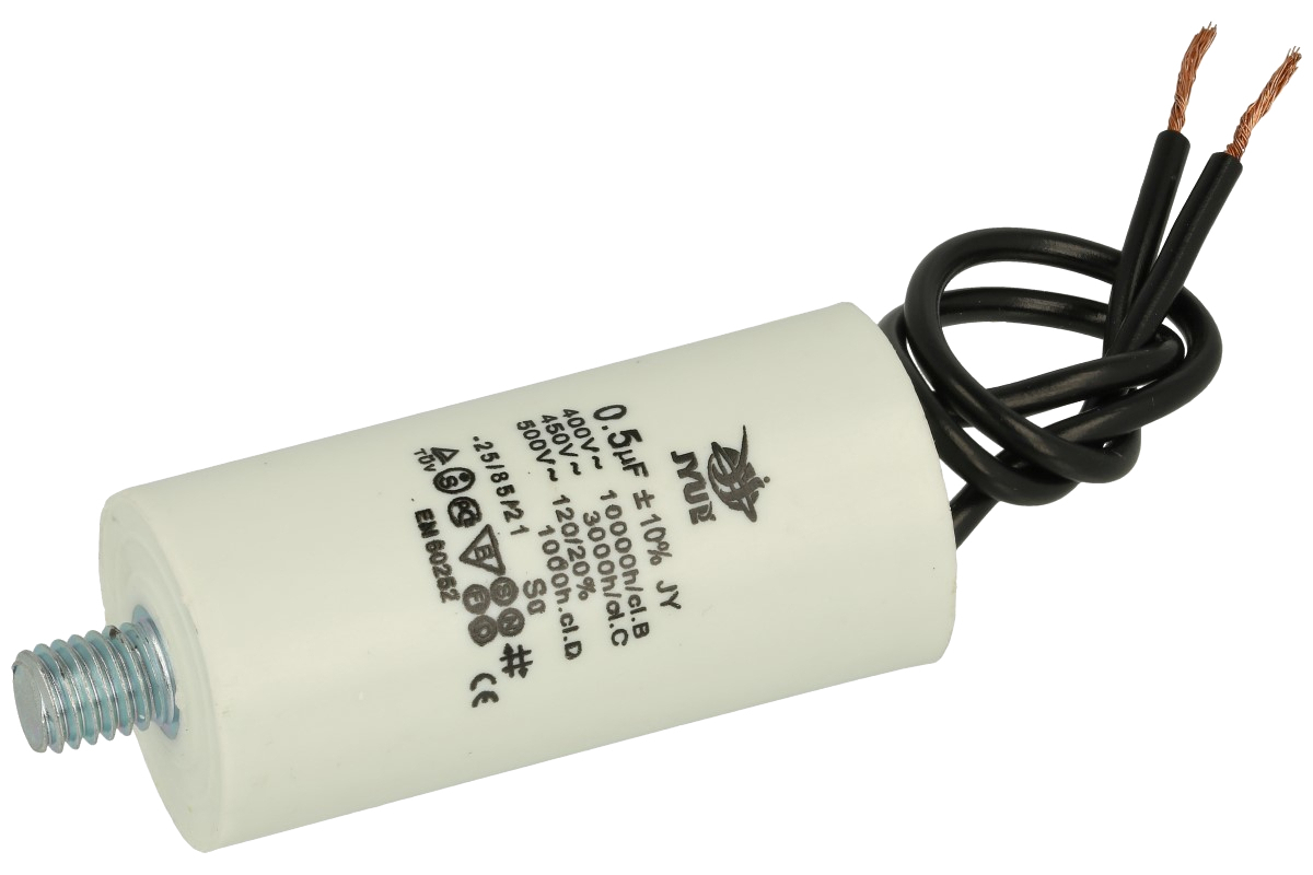 | Capacitor; motor; MKSP; 0,5uF; 450V AC; fi 26x55mm; with cables; screw with a nut; JYC; RoHS | |||||||||||||||