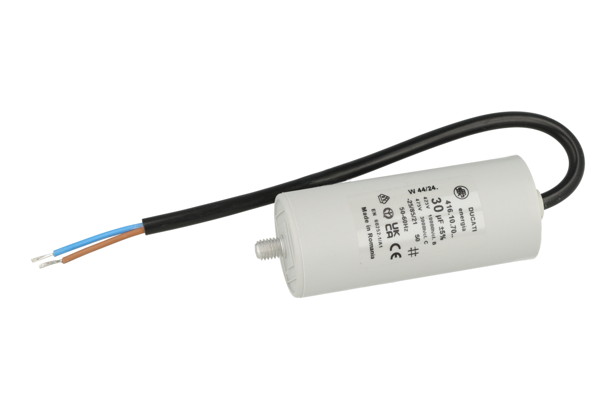 | Capacitor; motor; polypropylene; 416107014; 30uF; 425V AC; fi 40x92mm; with cables; screw without nut; Ducati; RoHS | |||||||||||||||