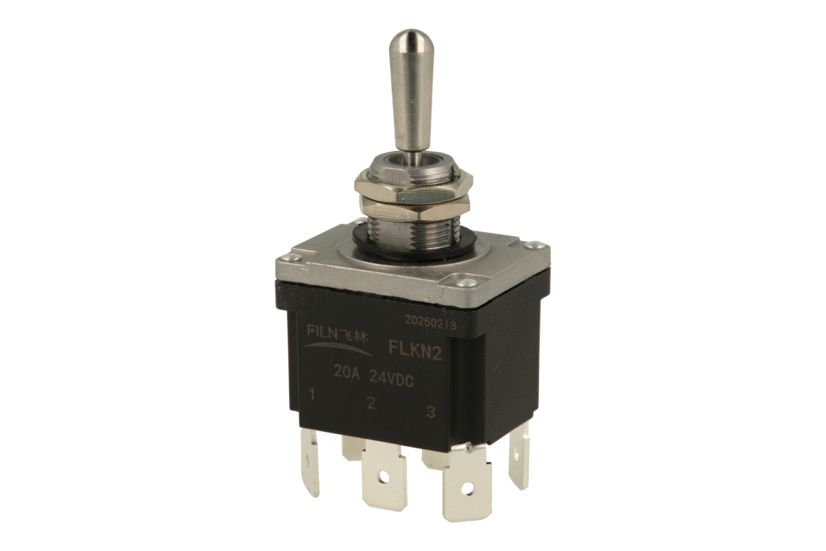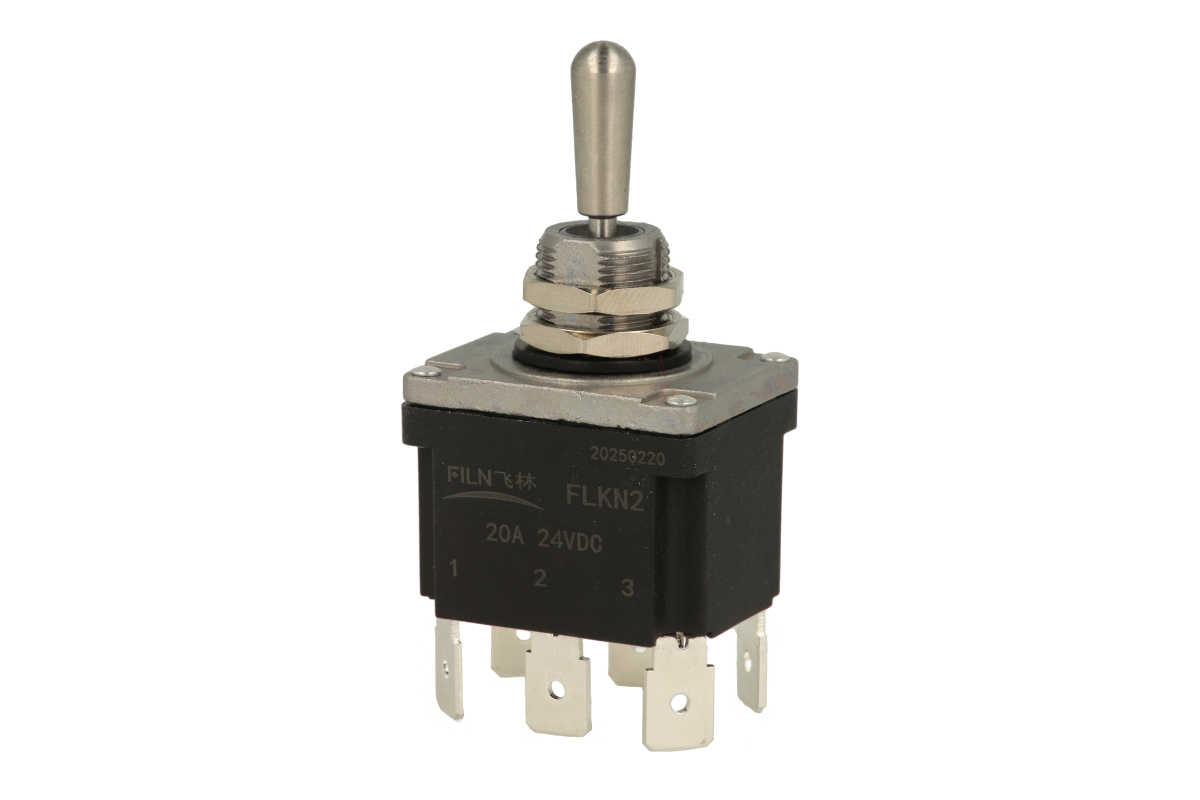 | Switch; toggle; FLKN2-23N-P_G24V; 2*3; ON-OFF-ON; 2 ways; 3 positions; bistable; panel mounting; green; LED 24V backlight; 6,3x0,8mm connectors; 20A; 250V AC; black; IP67; 37mm; FILN | |||||||||||||||