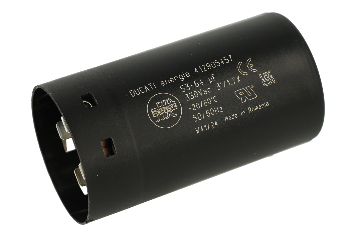 | Kondensator; silnikowy (rozruchowy); 412805457; 59uF; 330V AC; fi 45,5x84mm; konektory 6,3mm; Ducati; RoHS | |||||||||||||||
