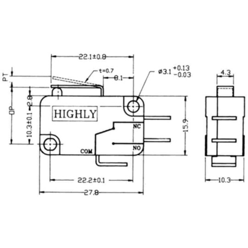 | Mikroprzełącznik; VS15N03-1C; dźwignia; 54,1mm; 1NO+1NC wspólny pin; szybkie; konektory 6,3mm; 15A; 250V; Highly; RoHS | |||||||||||||