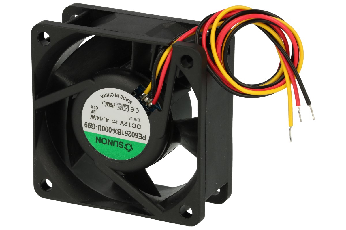 | Wentylator; PE60252BX-000U-G99; 60x60x25mm; kulkowe; 24V; DC; 4,56W; 93,5m3/h; 37,5dB; 190mA; 3400RPM; 3 przewody; Sunon; RoHS; 10÷27,6V; 300mm | |||||||||||||||
